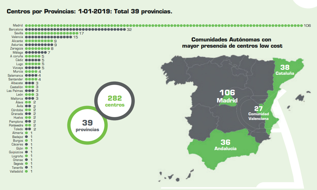 Se reflejan aquellos centros deportivos cuyo precio máximo es de 23,99€ (crecimiento de 1€ más que en la anterior edición), ampliando incluso en un breve margen hasta las 29,90€ IVA incluido. Se han registrado 39 empresas (un -4,9% menos que en el informe anterior), que engloban 282 centros diferentes, un 8,8% más de centros en comparación con 2018.