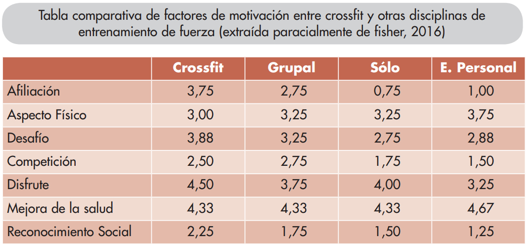CONCLUSIONES: Los hallazgos sugieren que las motivaciones para participar en CrossFit pueden ser similares a las observadas en la participación deportiva, y por lo tanto pueden influir en facilitar la adherencia a largo plazo en comparación con otras modalidades de ejercicios de fuerza. Este artículo también analiza los motivos relacionados con la salud como de naturaleza extrínseca pero que reflejan características intrínsecas (aspecto afirmado en otros estudios similares como el publicado por Bycura -2017- o Martin -2018), lo que posiblemente también facilita la adherencia a largo plazo (luego comentamos este aspecto). La presente investigación ayuda a desarrollar una mayor comprensión de las variables motivacionales dentro de diferentes modalidades de ejercicios de resistencia.
