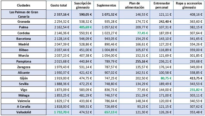 Según la encuesta, Las Palmas de Gran Canaria es la ciudad donde la gente se gasta más en salud y fitness y Valladolid donde menos. Por su parte, Pamplona es la ciudad que más se preocupa por los planes de nutrición.