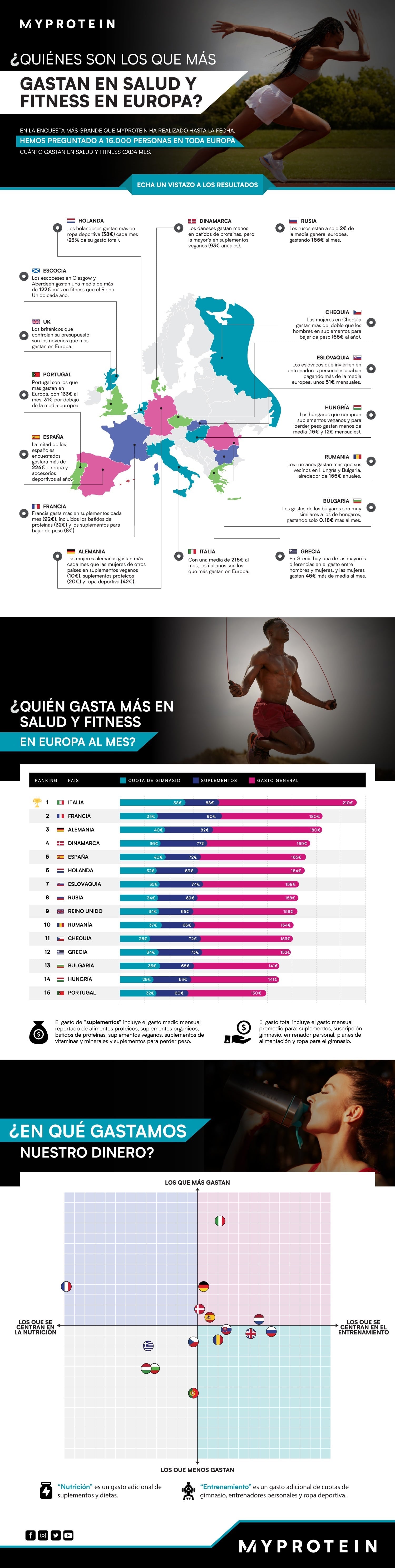 Myprotein ha preguntado a más de 16 000 participantes de 15 países europeos cuánto gastan mensualmente en salud y fitness —desde batidos proteicos, suscripciones en el gimnasio, planes nutricionales y mucho más— y estos son algunos de los descubrimientos más importantes de nuestra investigación: