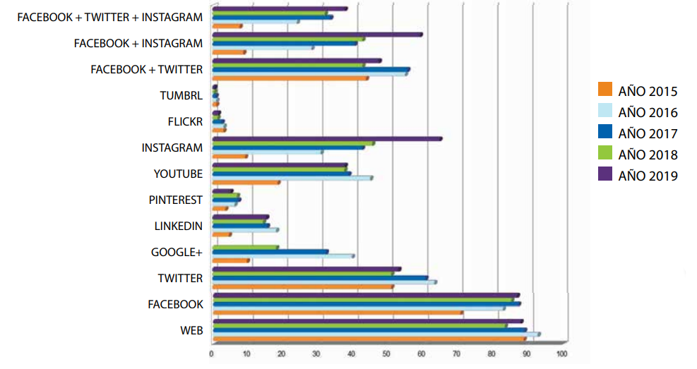 Los resultados obtenidos en esta edición muestran que el 87,76% de las 196 empresas analizadas utiliza su propia web corporativa, Ha aumentado su popularidad respecto al estudio del 2018 en el que representaba un 83,26%. Sigue siendo inferior a los resultados obtenidos en 2017 (88,79%) y 2016 (92,67%).