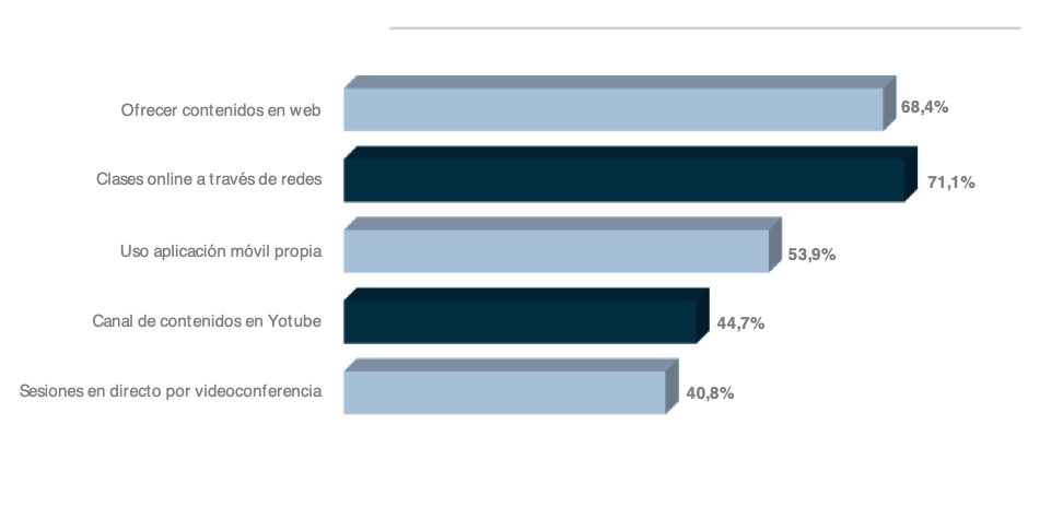 Por otro lado, a raíz del confinamiento y con el objetivo de mantener activos a los clientes, más del 71% de los centros de fitness están ofreciendo contenidos digitales en web, clases online en redes sociales y en Youtube (Figura 3).