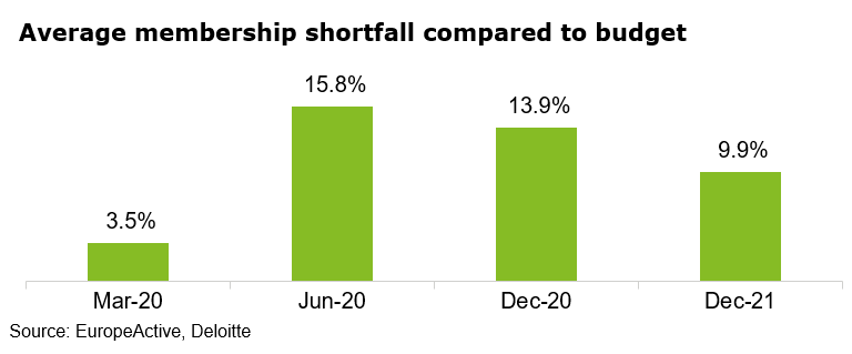 Al 31 de marzo de 2020, los operadores encuestados experimentaron un déficit de suscripciones de alrededor del 3,5% de media en comparación con su presupuesto original. En comparación, al 30 de junio de 2020, estos déficits alcanzaron su punto más alto con alrededor del 15,8%, principalmente como una combinación de cancelaciones de suscripciones y la ausencia de nuevos flujos de socios durante el cierre de clubs. El déficit medio en comparación con el presupuesto con respecto al número de clubs ascendía a solo el 2,5% al 30 de junio de 2020.