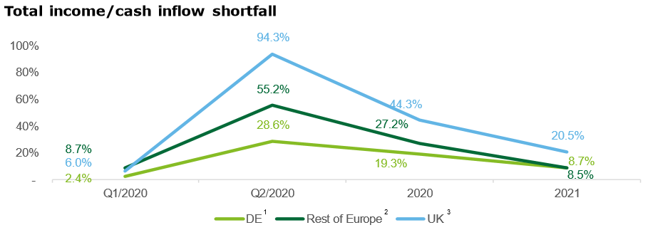 Cabe señalar que los déficits de ingresos varían considerablemente entre regiones. Los operadores con enfoque en el Reino Unido esperan los mayores déficits financieros en comparación con el presupuesto inicial. Los déficits de ingresos de los operadores centrados en el Reino Unido fueron especialmente altos en el segundo trimestre de 2020 (~ 94%). Esto se debe, entre otras cosas, a la interrupción de los esquemas de pago y los contratos mensuales rescindibles que, a diferencia de Alemania y la mayoría de los otros mercados europeos con contratos principalmente a más largo plazo, son más comunes en el mercado de fitness del Reino Unido.