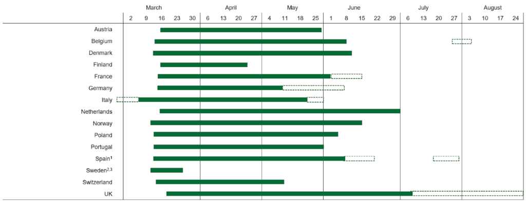Notas: 1) El segundo encierro en Cataluña (del 17 de julio al 29 de julio) se detuvo por decisión judicial; 2) No hubo restricciones gubernamentales w.r.t. cierres de clubes; 3) Solo SATS;