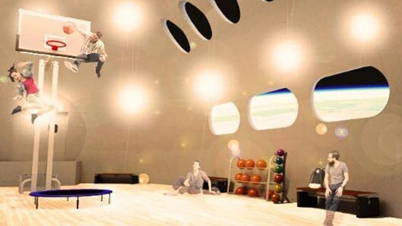 Aseguran que en este gimnasio de más de 7 metros de altura, se podrá practicas ejercicio las 24 horas. En primer lugar, “la gran sala de recreación tiene un techo de más de 7 m. de altura, perfecto par encestar en una canasta , algo posible teniendo en cuenta que la gravedad será de 1/6 en relación a la Tierra. Por supuesto contará también con sala de pesas y equipamiento de cardio.