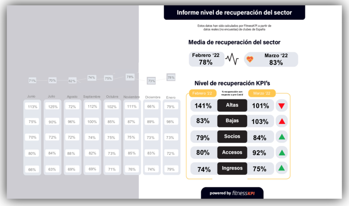 A tan solo un 17% de la recuperación completa, los datos de marzo son protagonistas por la recuperación en Socios, que se sitúa en el 84%, 5 puntos por encima del mes anterior. Este dato es muy esperanzador porque es el segundo mes consecutivo con una importante recuperación en el número de socios, y también porque todavía quedan dos meses antes del verano, abril y mayo, que podrían traer buenos datos de recuperación, según el Informe recuperación post Covid-19 en Marzo 2022 de Pablo Viñaspre