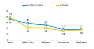Figura 2. Comparativa de las principales motivaciones que encuentran los ciudadanos de la UE y los españoles a la hora de practicar deporte (En porcentaje de población).