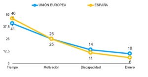 Figura 3. Comparativa de las principales barreras que encuentran los ciudadanos de la UE y los españoles a la hora de practicar deporte (En porcentaje de población).