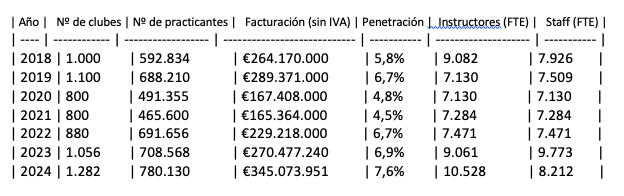 Estos valores son ligeramente inferiores a los de 2023, debido al movimiento de socios hacia segmentos de precios más altos. El 73,5% de los clubes pertenecen al segmento Mid-Market, que concentra el 85,1% de los socios y representa el 84,8% del total de la facturación.