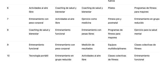 Sin embargo, hay coincidencias: 5 tendencias del Top 10 coinciden entre ambos países: ejercicio para mayores, pérdida de peso, entrenamiento de fuerza tradicional, salud mental y entrenamiento funcional.