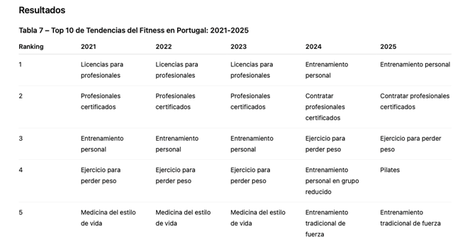 Por quinto año consecutivo, se analizaron las tendencias del fitness en Portugal. La encuesta portuguesa sobre tendencias del fitness se basó en el estudio mundial de tendencias de fitness del American College of Sports Medicine (ACSM) e incluyó 51 tendencias. Además de las 45 tendencias recogidas en el informe del ACSM para 2025, se incluyeron 6 tendencias adicionales según las recomendaciones de expertos: clases colectivas de fitness, crosstraining, gimnasios ecológicos (EcoGyms), medición de resultados, entrenamiento del core y entrenamientos basados en danza.