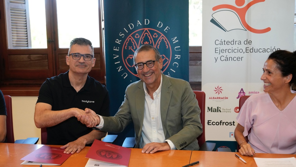 La Universidad de Murcia ha formalizado esta mañana un convenio de colaboración con la empresa murciana Bodytone International Sports, S.L., mediante el cual la compañía realiza una donación de material deportivo valorado en 18.085,87 euros. Esta aportación se destinará a las actividades de la Cátedra Ejercicio, Educación y Cáncer, un proyecto impulsado desde la UMU que utiliza el ejercicio físico como herramienta terapéutica para personas con cáncer.
