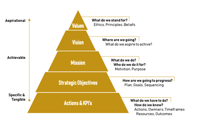 La parte superior de la “Pirámide de Estrategia” está formada por los valores: ¿en qué creemos? ¿Cuáles son los principios, la ética y las creencias que compartimos? El proceso de desarrollar la gestión estratégica comienza con la descripción de los valores.