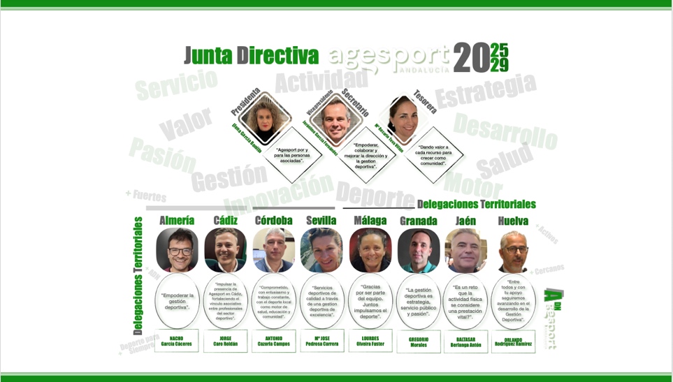AGESPORT ha constituido oficialmente su nueva Junta Directiva para el período 2025–2029, tras culminar el proceso de renovación de los órganos de gobierno de la asociación. Esta nueva etapa se inicia con el objetivo de consolidar el papel de la Asociación Andaluza de Gestores del Deporte como entidad de referencia en la gestión y dirección deportiva en Andalucía, reforzando su capacidad de representación, su presencia territorial y el valor que aporta a las personas asociadas.